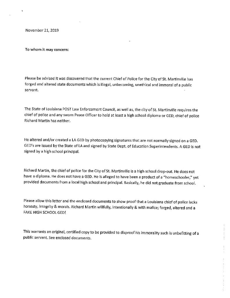 Fuselier said the writer ended the letter with, “Please allow this letter and the enclosed documents to show proof that a Louisiana chief of police lacks honesty, integrity and morals. Richard Martin willfully, intentionally and with malice forged, altered and faked a high school GED.”