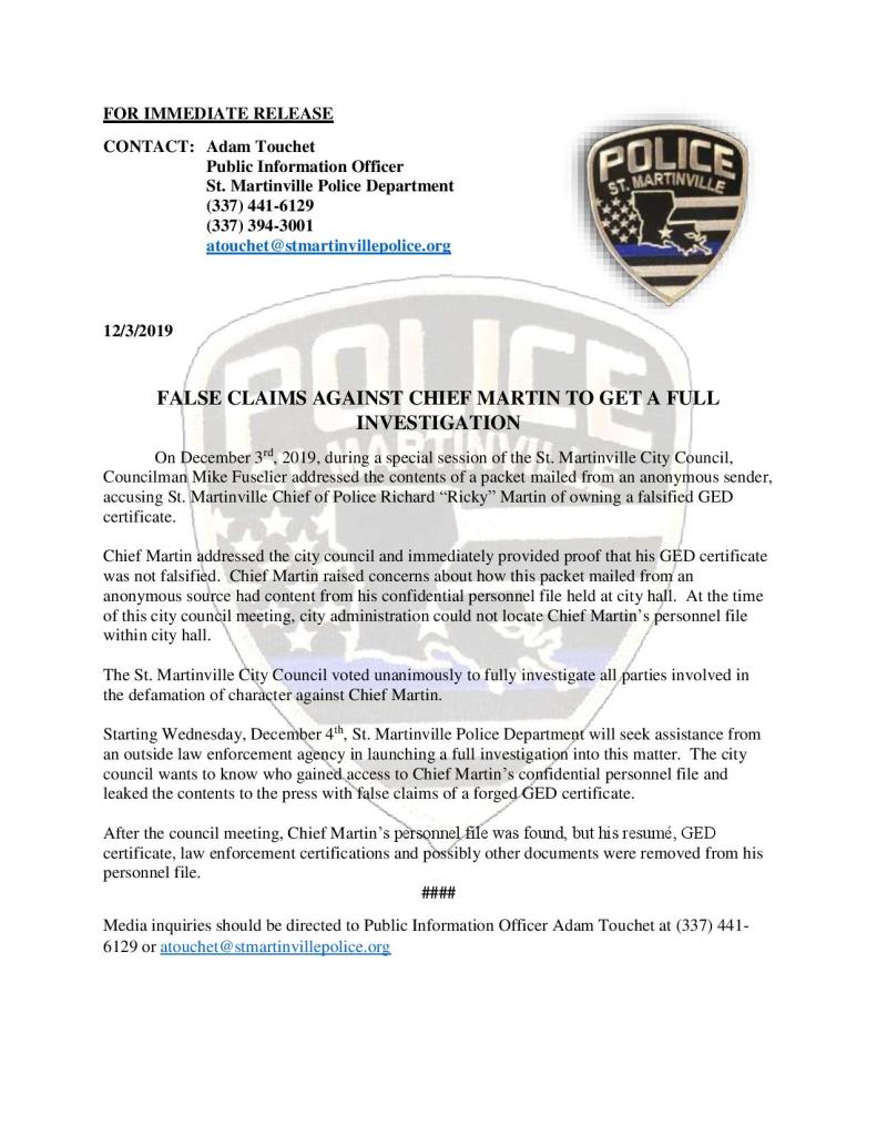 After an anonymous letter claiming the St. Martinville’s chief of police had a fraudulent GED on file with the city, the special city council voted to open an investigation during their meeting on Dec. 3.