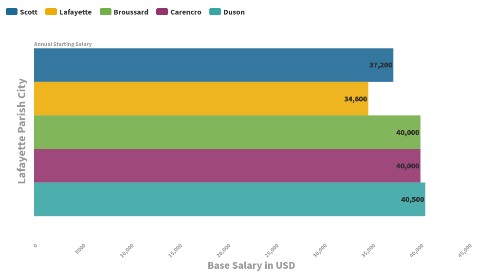 Officers in the cities of Scott, Broussard, Carencro, Lafayette and Duson do not currently make a consistent base pay. As a result, jobs in cities where the starting salary is higher are more sought after and have higher number of applicants than cities with lower starting salaries.