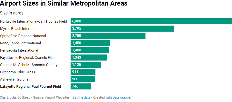 Compared with airports from areas with a similar population to the Lafayette area, the Lafayette airport is smaller both in size and in the number of passengers it sees.