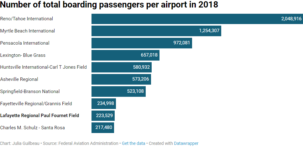 Even with the airport’s growth, the overall number of boarding passengers passing through Lafayette Regional Paul Fournet Field is still lower than other areas. In 2018, the Lafayette airport had the second smallest total number of boarding passengers compared to airports in similarly populated areas, according to data from the Federal Aviation Administration.