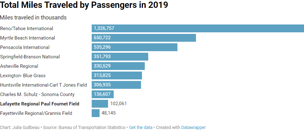 The Lafayette airport also had the second lowest number of total passenger miles traveled domestically, or within the United States, in 2019. Passengers averaged about 2,000 miles traveled during 2019, according to data from the Bureau of Transportation Statistics.