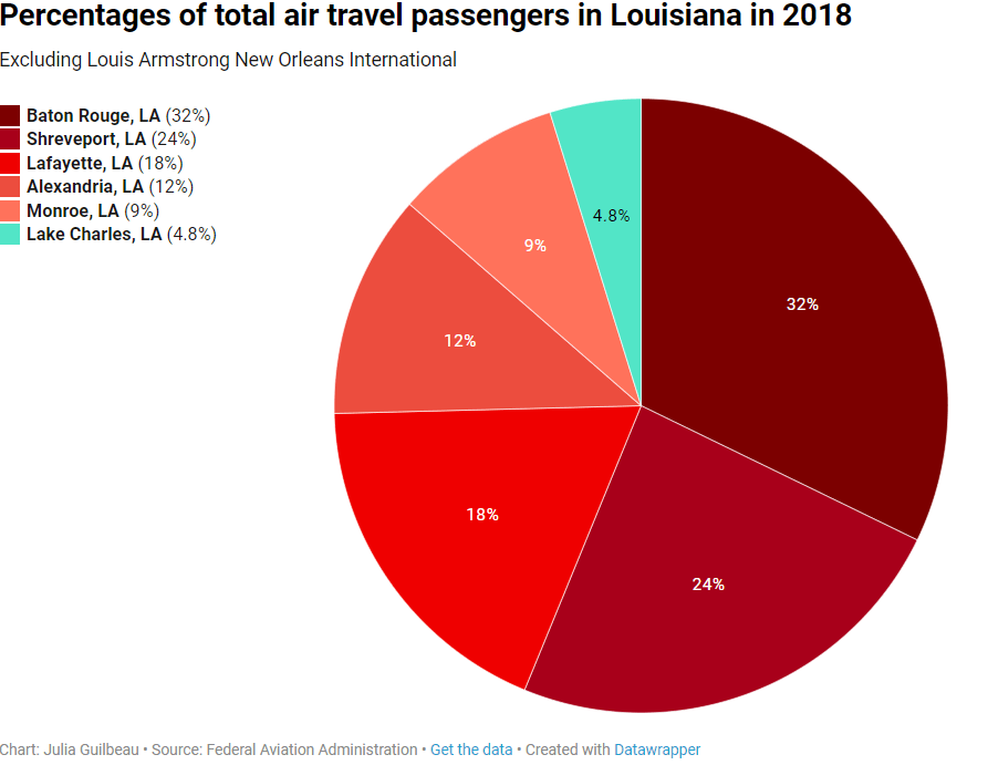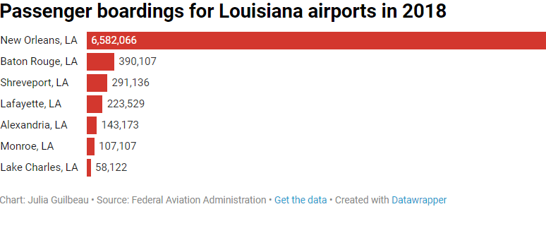 Lake Charles Regional had the lowest number of passengers boarding in the state in 2018, according to data from the Federal Aviation Administration. The number of boarding passengers the airport saw was almost 50% less than the Monroe airport, the second smallest major airport in the state.