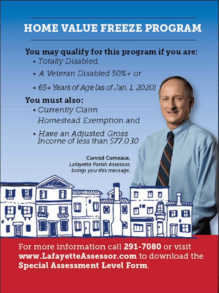 The special assessment level, also known as the “home value freeze program,” allows certain homeowners to freeze the value of their property, according to Conrad Comeaux, the Lafayette Parish Assessor. If a person qualifies for the special assessment level, their property value would not increase even if the value was reassessed in the future.